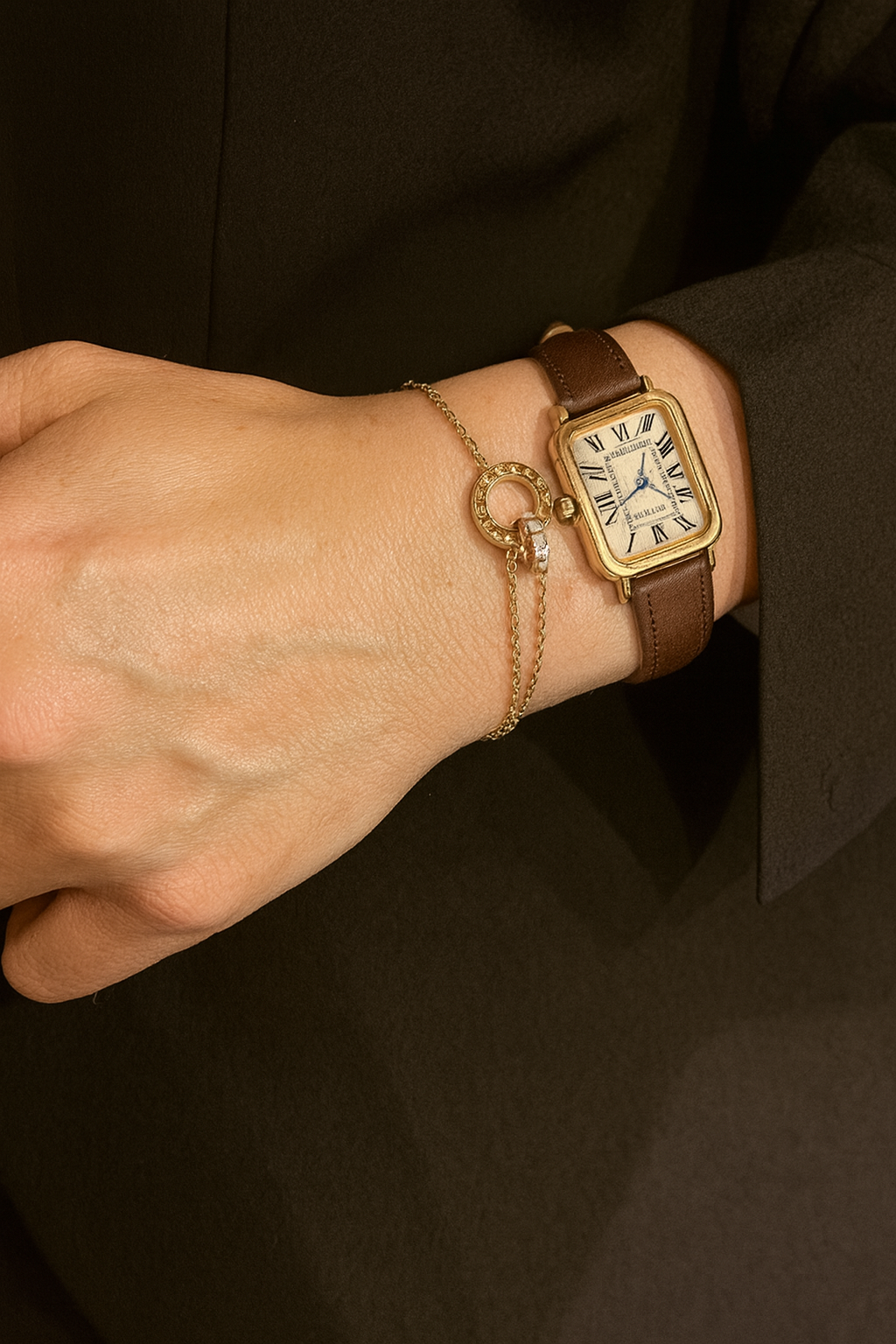 This timepiece and jewelry pairing offers a complete and harmonious accent for any refined ensemble. The classic rectangular watch, secured with a fine leather band, is perfectly complemented by the delicate bracelet.