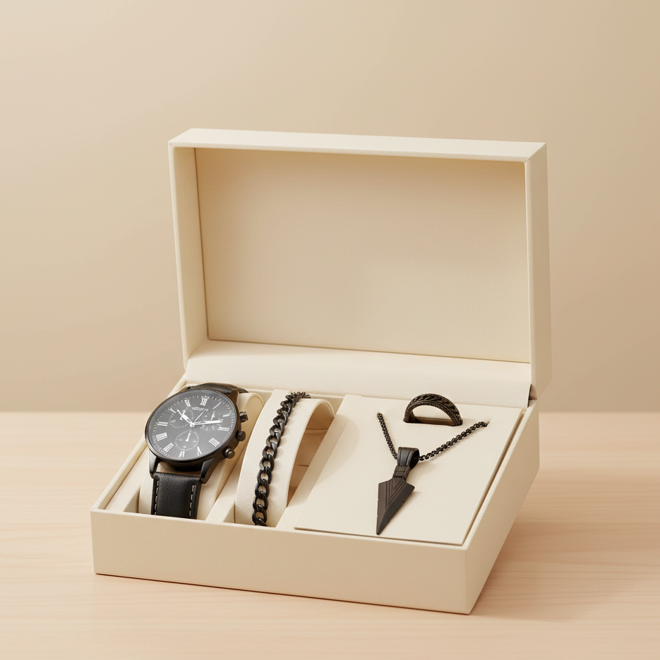 A carefully curated box set featuring a watch, bracelet, ring, and necklace provide the foundation for a polished, contemporary wardrobe. Each piece features a rich, uniform black finish that conveys quiet confidence and deliberate design.
